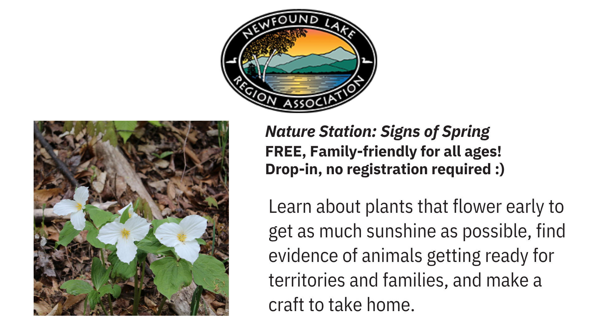 Follow this link for more details and to learn more about NLRA: https://www.newfoundlake.org/event/nature-station-signs-of-spring