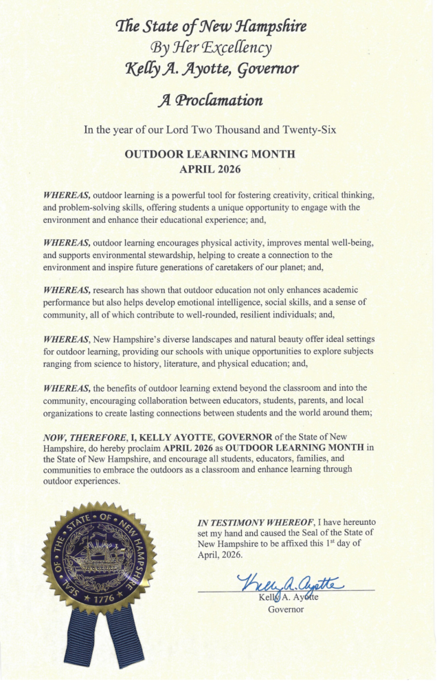 As part of this broader effort to elevate outdoor learning across the state, NHEE submitted a request to designate April 2026 as Outdoor Learning Month in New Hampshire. We are thrilled to share that Governor Kelly Ayotte has officially proclaimed April as Outdoor Learning Month, recognizing the powerful role that outdoor experiences play in supporting student learning, health, and environmental stewardship. This proclamation highlights New Hampshire’s commitment to ensuring all learners have access to meaningful, place-based educational opportunities.